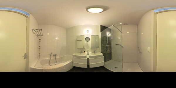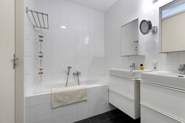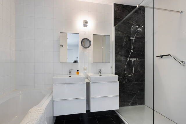 De badkamer van circa zes vierkante meter is ruim en volledig betegeld. Hier vindt u een ligbad, een separate douche en een dubbele wastafel met een meubel en spiegel. De wanden zijn betegeld in een lichte kleurstelling, terwijl de vloer is uitgevoerd in een antracietkleur.