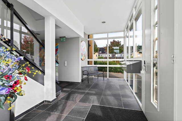 Het portiek telt slechts acht appartementen, waardoor er een prettige en gemoedelijke sfeer heerst. De gezamenlijke entree is representatief en voorzien van zowel een lift als een trappenhuis. Alles is keurig onderhouden en verzorgd, wat direct bij binnenkomst een gevoel van kwaliteit en exclusiviteit geeft. Op de begane grond beschikt u over een eigen berging en in de afgesloten parkeergarage over een vaste privéparkeerplaats, zodat u altijd verzekerd bent van een veilige en comfortabele parkeerplek.