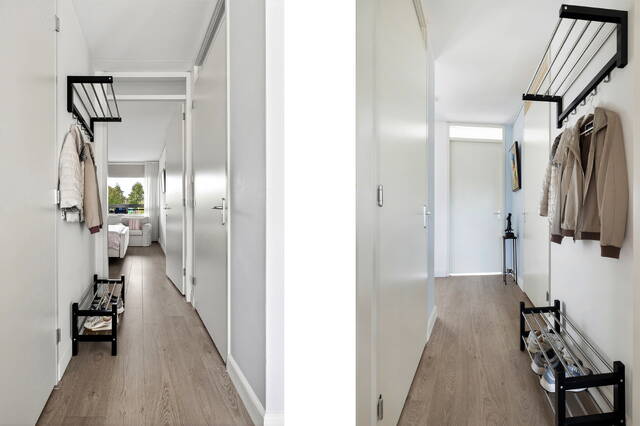 Bij binnenkomst in het appartement komt u in een ruime hal met meterkast, videofooninstallatie en een modern toilet met fonteintje. Vanuit deze centrale ruimte zijn alle vertrekken bereikbaar, wat zorgt voor een logische en praktische indeling.