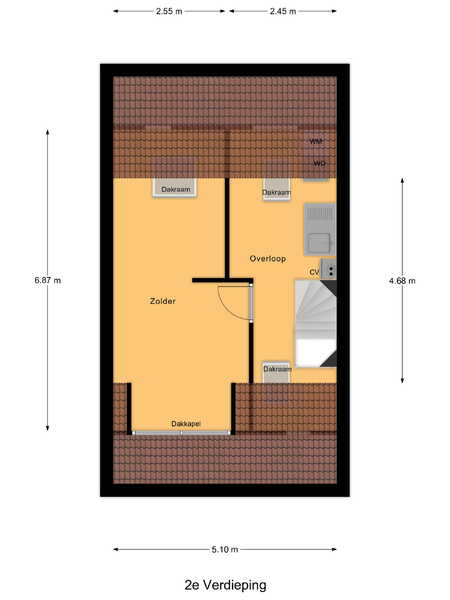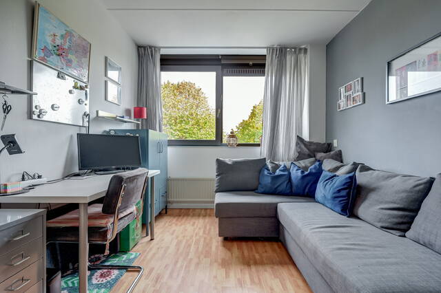 (ca. 20 m²) met dakkapel aan de voorzijde, wat zorgt voor extra licht en ruimte. Hier is eenvoudig een vijfde slaapkamer te realiseren. Daarnaast vind je hier de cv-installatie, aansluitingen voor wasmachine en droger, een klein keukenblokje met warm/koud stromend water en extra bergruimte. De aanwezige dakramen zorgen voor een prettige lichtinval. De tweede verdieping is afgewerkt met een parketvloer.