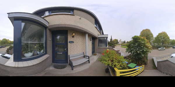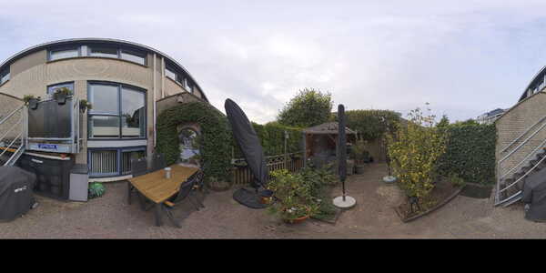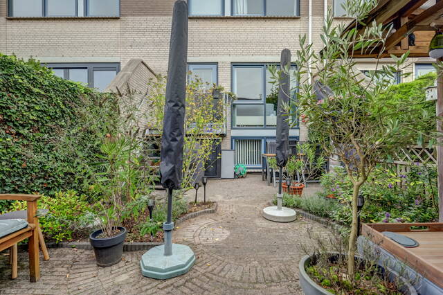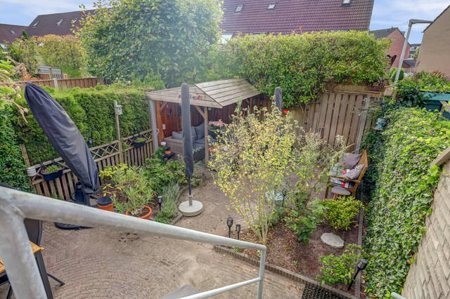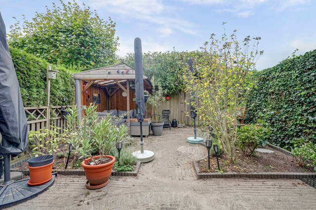 De achtertuin is fraai aangelegd met bestrating, groene borders en een gezellige overkapping met zithoek. Een heerlijke plek om te ontspannen of te genieten van lange zomeravonden. De tuin biedt veel privacy dankzij de hoge groene erfafscheiding en is via een achterom bereikbaar.