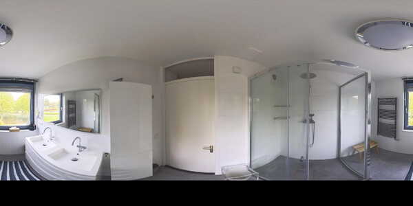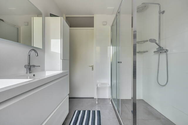 De moderne badkamer (ca. 6 m²) is vernieuwd in 2022 en is geheel betegeld in lichte tinten en uitgerust met een inloopdouche, dubbel wastafelmeubel, spiegel met verlichting en verwarming en een handdoekradiator. Op de overloop is daarnaast een apart toilet aanwezig.