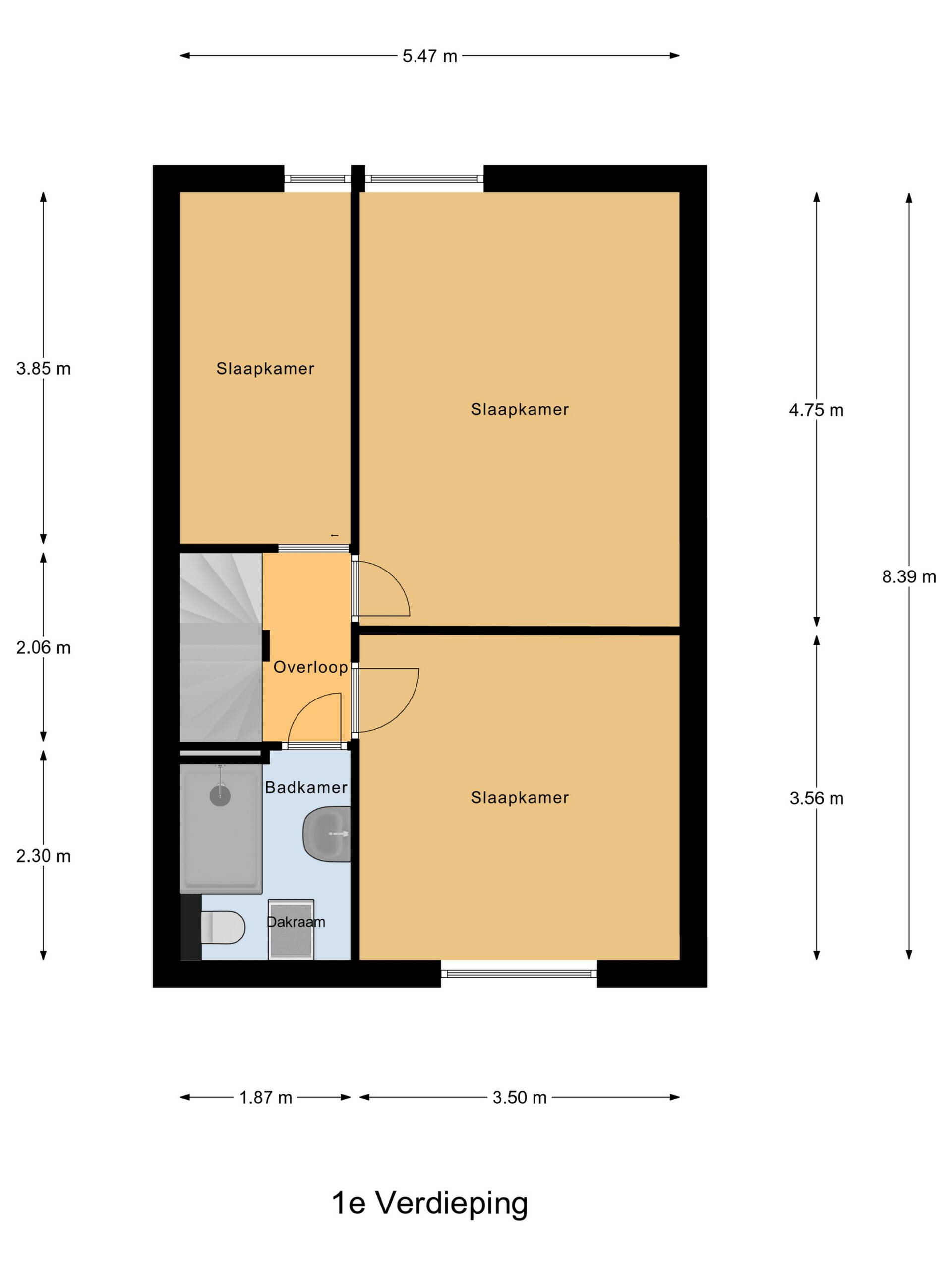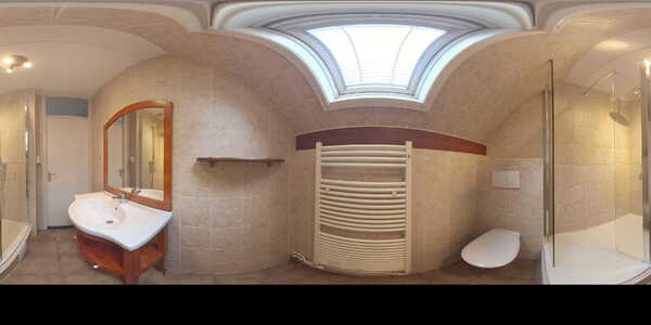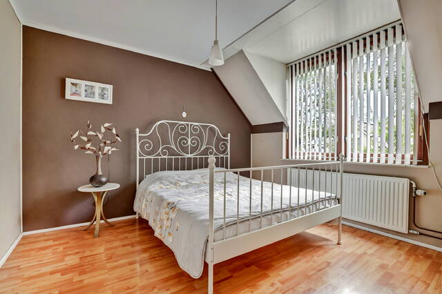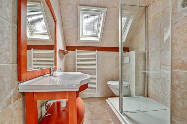 Op de eerste verdieping kom je op de overloop die toegang biedt tot drie slaapkamers. Twee ruime kamers aan de voor- en achterzijde van circa 17 en 12 m². De voorkamer beschikt over een rolluik. De derde slaapkamer van ca. 7 m² bevindt zich aan de achterzijde en heeft door het dakraam lekker veel lichtinval. De badkamer is voorzien van een ruime inloopdouche met glazen wand, mengkraan en zowel een hand- als regendouche. Daarnaast zijn er een tweede toilet, een wastafel met meubel en spiegel erboven, en een handdoekenradiator.