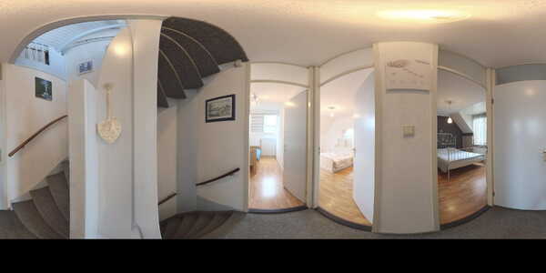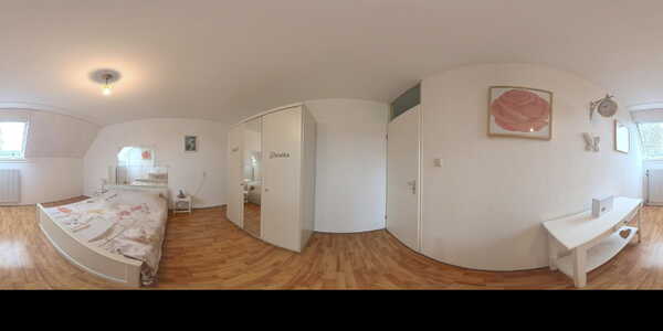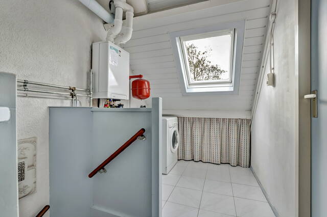 Met de trap loop je naar de tweede verdieping. Op de overloop is bergruimte onder de schuine kap en vind je de aansluitingen voor wasmachine en droger, evenals de cv-installatie (Intergas HRE, 2025). Achter de deur ligt de vierde slaapkamer van ruim 10 m², met zowel een dakraam aan de voor- als achterzijde en extra bergruimte achter de knieschotten.