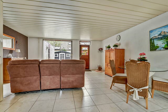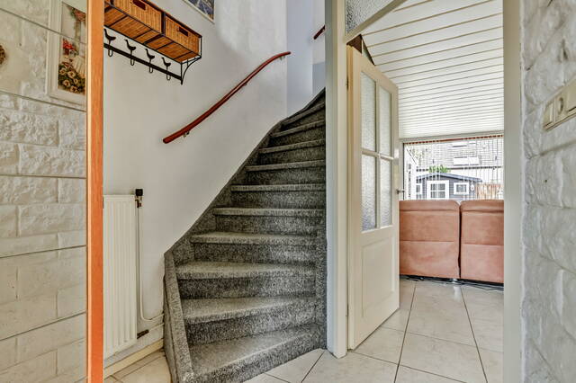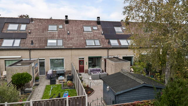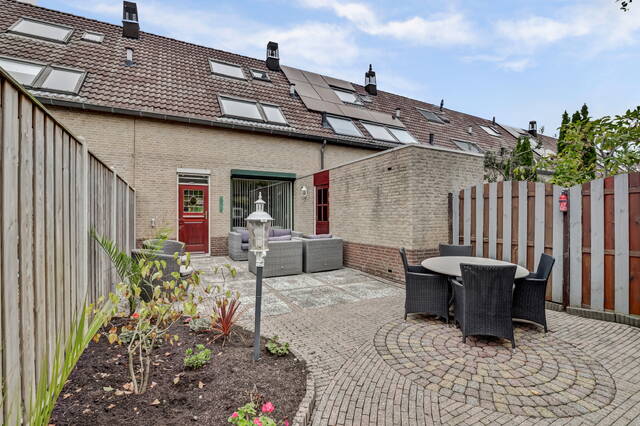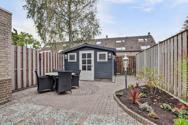 Aan de achterzijde loop je door de enkele deur naar de tuin. De tuin is een heerlijke buitenruimte van ca. 12 meter diep en leent zich perfect voor een gezellig eetgedeelte én een plek voor de loungeset. Daarnaast is er altijd wel een mooi plekje te vinden voor de barbecue. De tuin is grotendeels keurig betegeld en heeft een leuke, halfronde border met groen. Achterin de tuin vind je een grote houten schuur waar je via de achterom je fiets kunt stallen. Tegen het huis aan staat bovendien een stenen berging – ideaal voor het opbergen van de kussens van het tuinmeubilair.