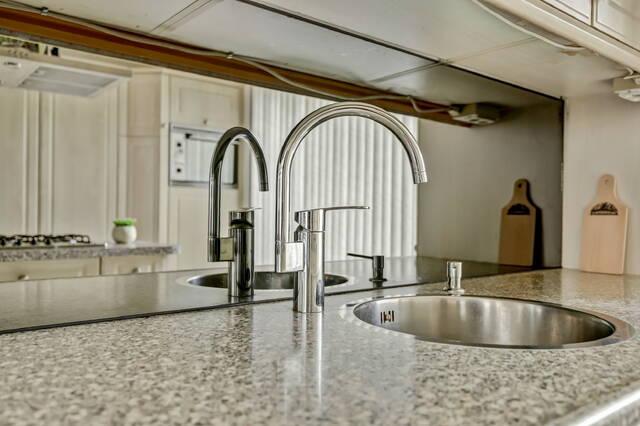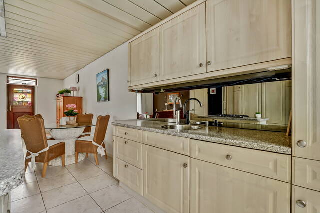 Terug in de woonkamer stap je aan de voorzijde de open keuken in: een nette keuken voorzien van diverse inbouwapparatuur. Je kookt op het kookeiland op gas en beschikt daarnaast over een vaatwasser, koelkast, vriezer en een spoelbak met mengkraan. Er is lekker veel bergruimte in alle kasten – zowel grote hoge kasten als laden en onderkastjes – dus meer dan genoeg plek voor servies en keukenspullen. Door het grote raam aan de voorzijde komt heerlijk veel licht binnen en kijk je prettig weg over het groen, de stoep en het fietspad.