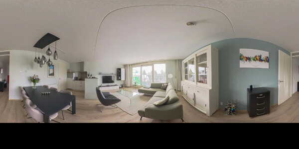 De woonkamer is te betreden via een moderne paneeldeur en biedt direct een gevoel van ruimte en licht. De grote schuifpui aan de achterzijde zorgt voor een prachtige lichtinval en geeft toegang tot het royale dakterras.
