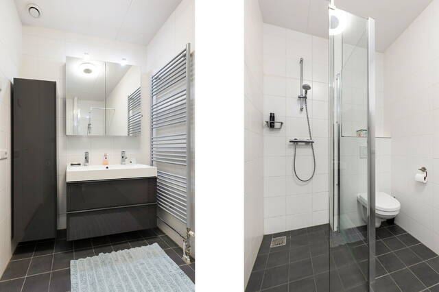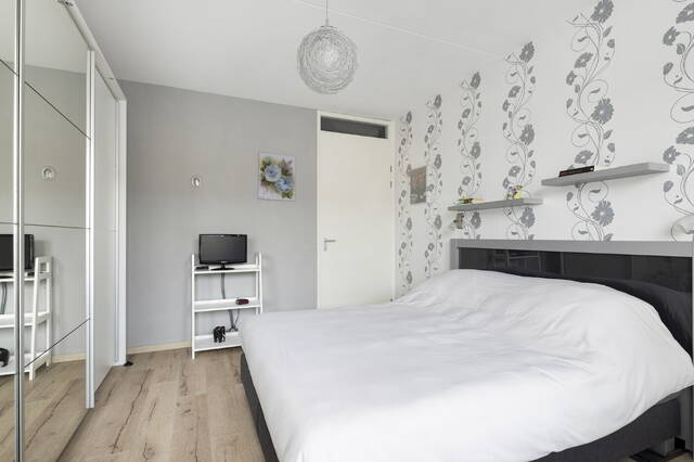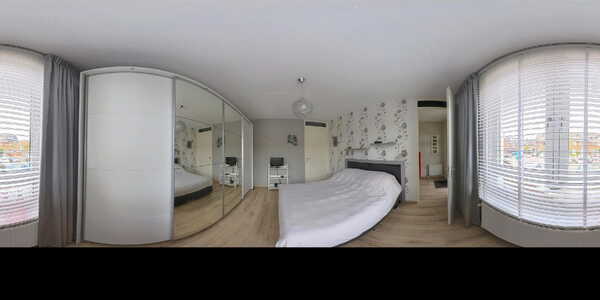 De slaapkamer is praktisch ingedeeld, voorzien van een vaste schuifkastenwand en biedt toegang tot de badkamer. Deze badkamer is geheel betegeld in een stijlvolle wit/grijze kleurstelling en uitgerust met een inloopdouchecabine, hangend toilet, dubbel wastafelmeubel met spiegelkast en een aparte bergkast, strak, fris en modern.