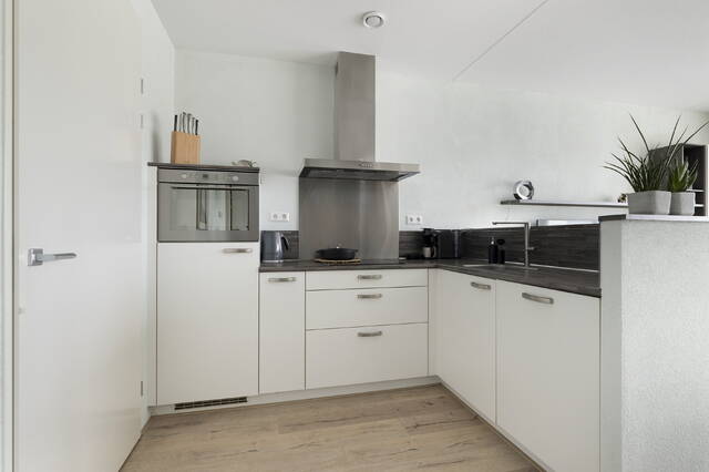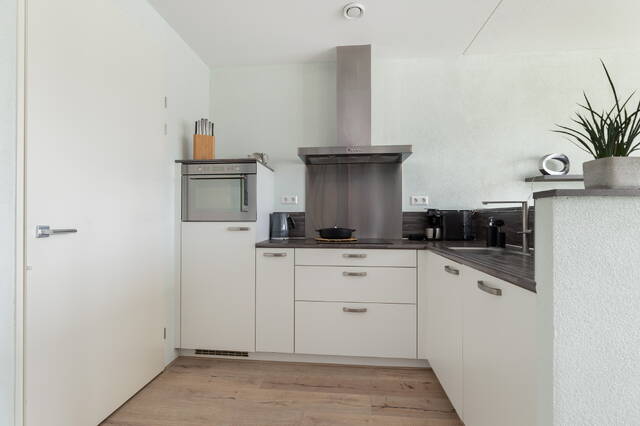 De open keuken in hoekopstelling is uitgevoerd in een lichte kleurstelling met een houtlook kunststof aanrechtblad. De keuken is voorzien van diverse inbouwapparatuur: een combi-oven, 4-pits keramische kookplaat, RVS afzuigkap en koelkast, alles binnen handbereik voor de kookliefhebber.