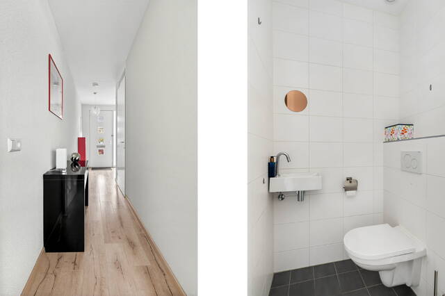 Er is tevens een separate toiletruimte met een hangend toilet en fonteintje, eveneens volledig betegeld in wit/grijs.