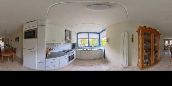 Aan de voorzijde ligt de open keuken in hoekopstelling, uitgerust met diverse inbouwapparatuur zoals een vaatwasser, afzuigkap, gaskookplaat, heteluchtoven, koelkast en magnetron. De keuken biedt vrij uitzicht aan de voorzijde en een praktische indeling.