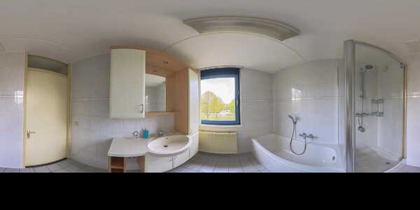 De badkamer is volledig betegeld en voorzien van een ligbad, douchecabine en wastafelmeubel met spiegel. Op de overloop bevindt zich een apart toilet (duoblok met fonteintje), eveneens wit betegeld.