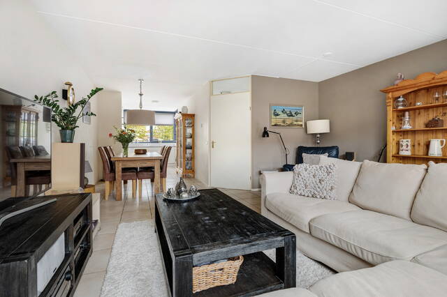 De lichte woonkamer aan de achterzijde biedt veel ruimte en prettig uitzicht op de tuin. Dankzij de grote raampartijen komt er veel daglicht binnen. Via een deur en trap is de achtertuin bereikbaar, voorzien van nette bestrating en een zonnescherm – een fijne plek om te ontspannen.