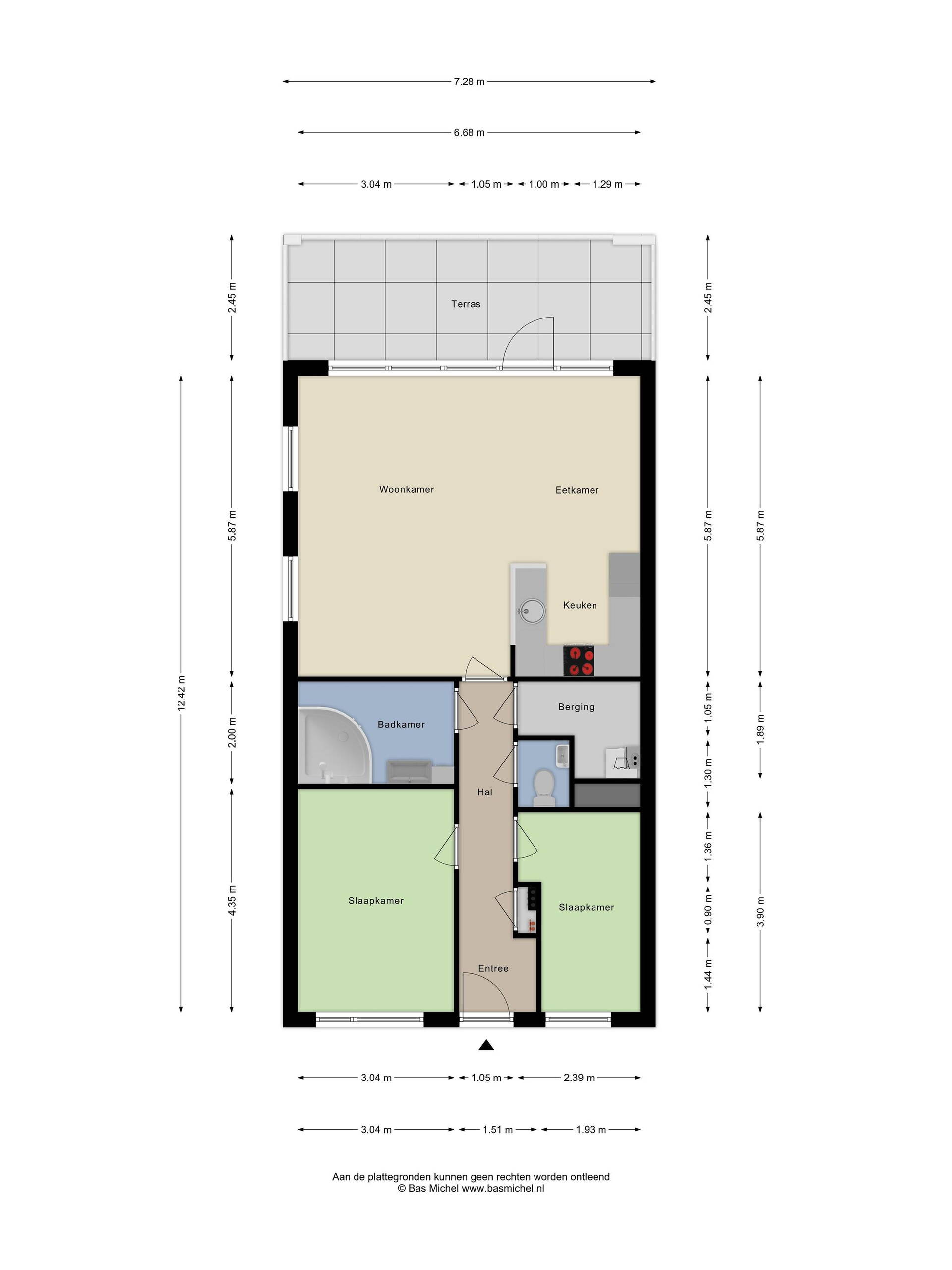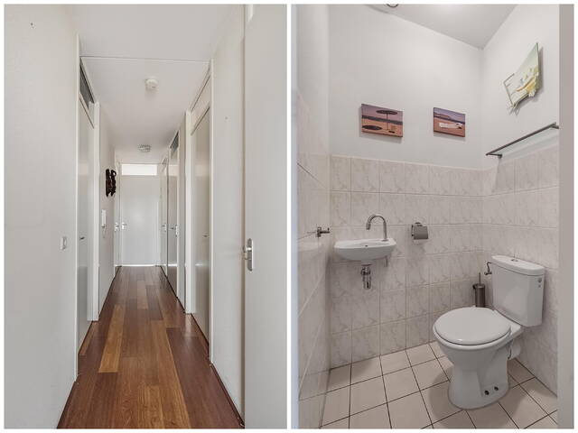 Via de overdekte galerij is het appartement te betreden. Entree, hal met meterkast en toegang tot alle vertrekken, toiletruimte voorzien van een duoblok toilet en fonteintje. De toiletruimte is gedeeltelijk betegeld in een neutrale kleurstelling.