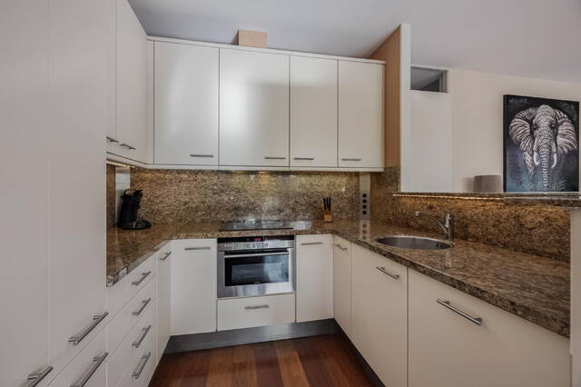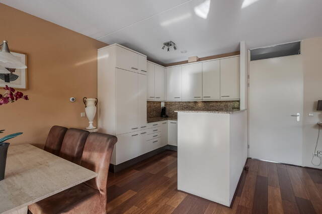 De moderne open keuken is uitgevoerd in een L-opstelling en voorzien van diverse inbouwapparatuur zoals een koelkast, keramische kookplaat, afzuigkap, combimagnetron en een vaatwasser. Verder is de keuken voorzien van een enkele spoelbak en een apotheekkast. Het geheel is uitgevoerd in wit en is afgewerkt met een granieten aanrechtblad, laminaatvloer, spotjes en sfeerverlichting.