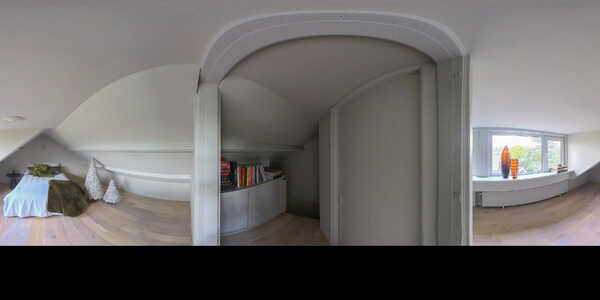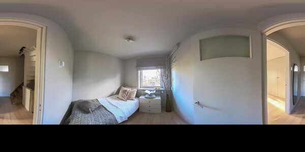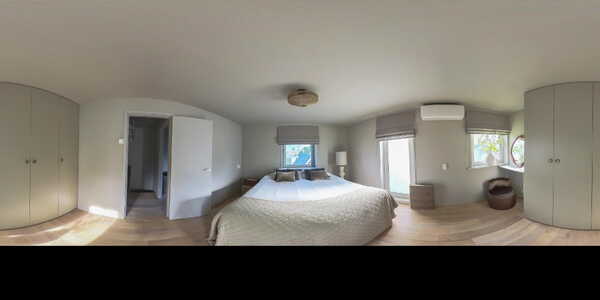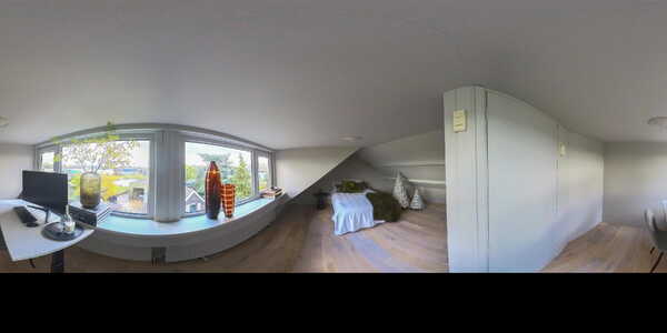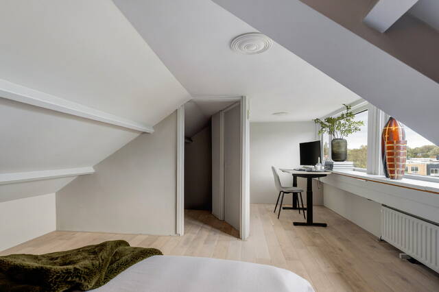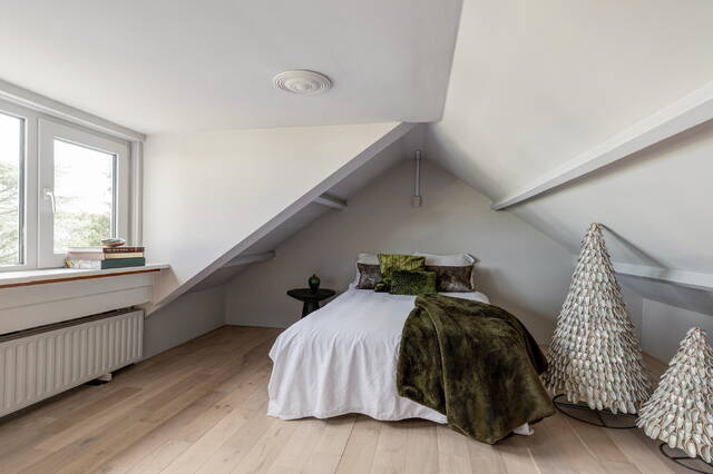De zolder is een ruime, lichte slaapkamer met grote dakkapel en houten vloer, perfect als extra slaapkamer, werk- of chillruimte. Slimme bergruimte houdt alles netjes en overzichtelijk.