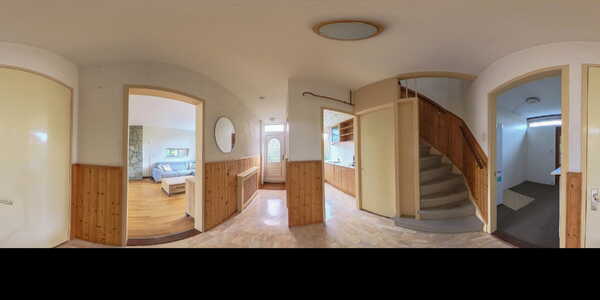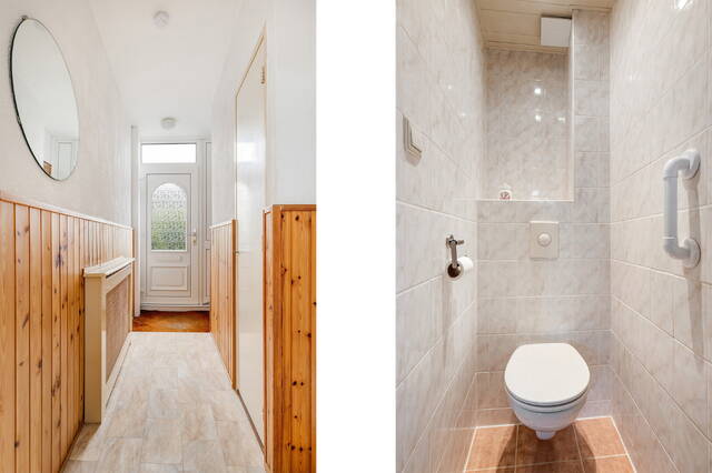 U betreedt de woning via de entreehal, waar zich de meterkast, trapkast, lichte toiletruimte met hangend toilet en de trap naar de eerste verdieping bevinden. Vanuit de hal heeft u toegang tot de woonkamer, keuken en bijkeuken.