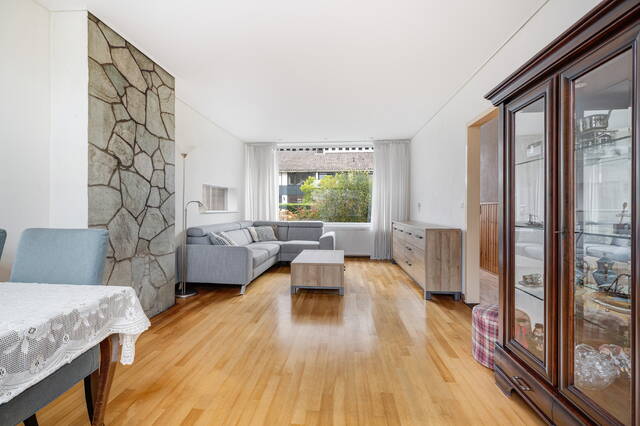 De doorzonwoonkamer is heel licht dankzij de grote ramen aan zowel de voor- als achterzijde. Hier ervaart u direct de prettige sfeer van deze woning. De kamer is voorzien van een parketvloer.
