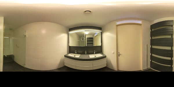 De badkamer is geheel betegeld in een lichte kleurstelling en beschikt over een inloopdouche met regendouche, een dubbel wastafelmeubel met veel bergruimte, een verlichte spiegelkast en een designradiator in matzwart.