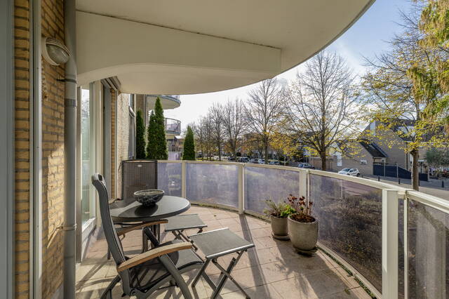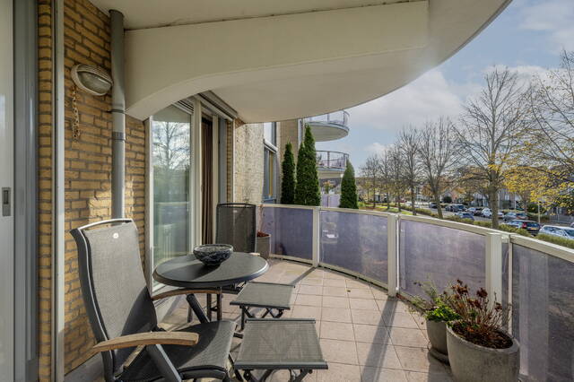 Het terras ligt op het westen en biedt een prachtig uitzicht over de groenstrook en het water voor het complex. Dankzij de ligging op de hoek heeft u een vrij uitzicht over de omgeving. Vanuit zowel de woonkamer als de hoofdslaapkamer is het terras direct toegankelijk via schuifpuien.