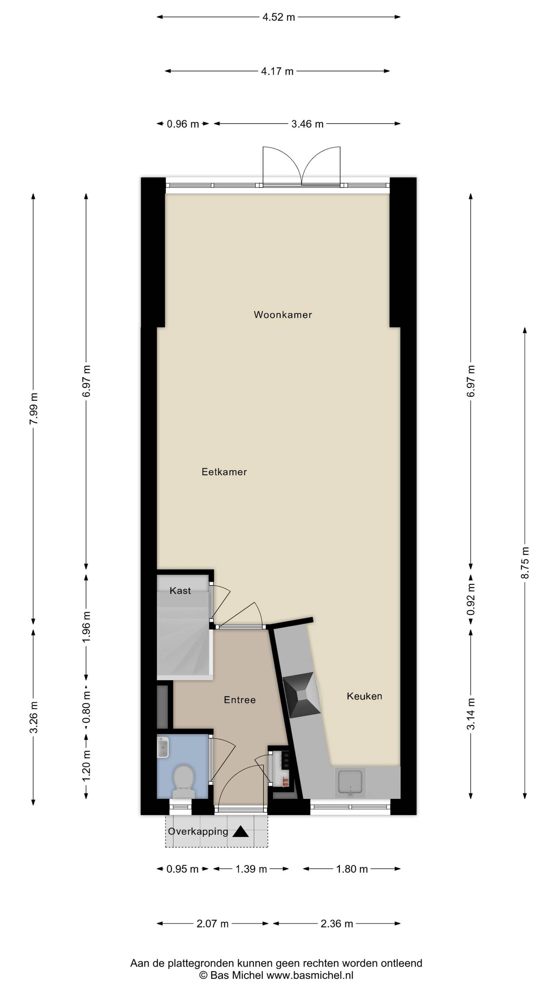 Entree, ruime hal met meterkast en trap naar de 1e verdieping, toiletruimte voorzien van een duoblok toilet en fonteintje. De toiletruimte is gedeeltelijk betegeld.