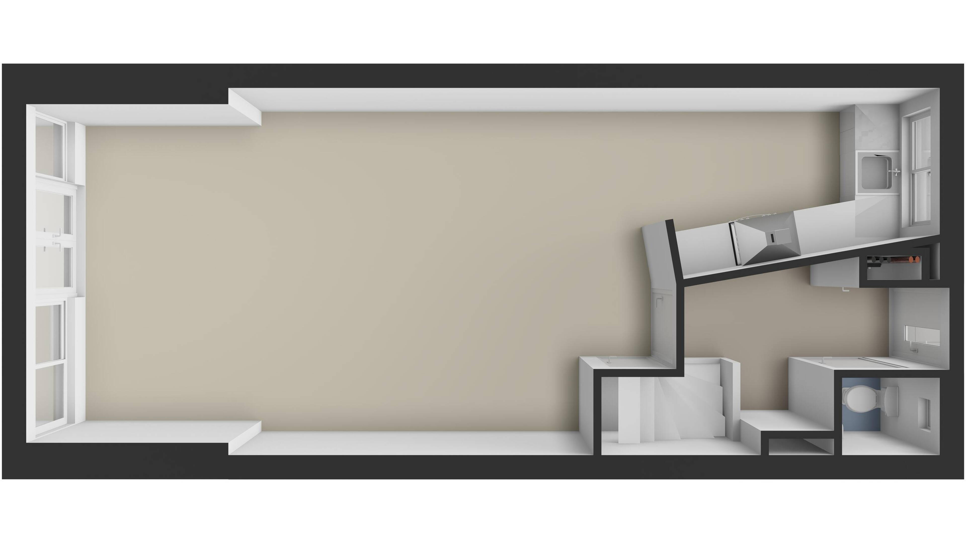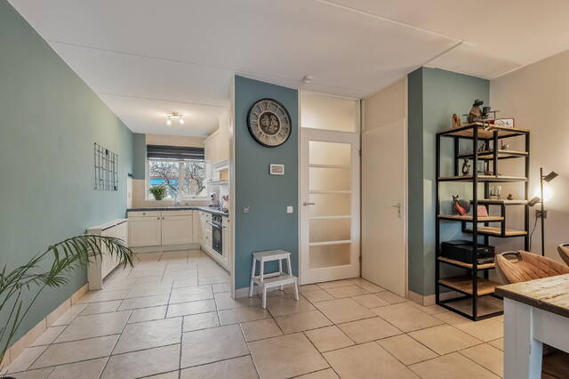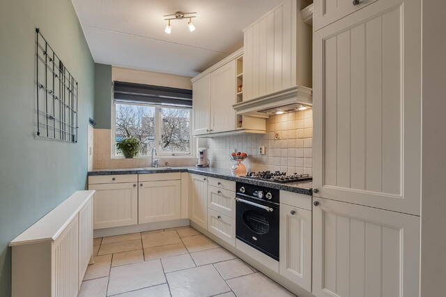 De woning beschikt aan de voorzijde over een moderne keuken (ca. 7 m2) met inbouwapparatuur. De keuken is uitgevoerd in een L-opstelling en voorzien van een koelkast, vrieskast, 4-pits gaskookplaat, afzuigkap, oven en een vaatwasser. Tevens is de keuken voorzien van een enkele spoelbak en voldoende kastruimte. Het geheel is uitgevoerd in lichte kleuren en afgewerkt met een natuursteen aanrechtblad en tegelvloer met vloerverwarming.