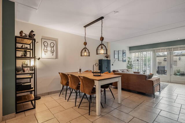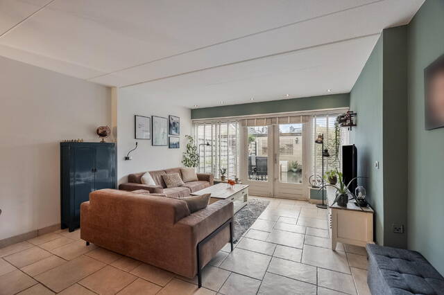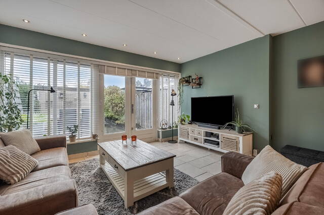 Uitgebouwde tuingerichte woonkamer (ca. 36 m2) voorzien van een lichte tegelvloer met vloerverwarming en grote raampartijen die zorgen voor een aangename, lichte leefruimte. De vloerverwarming op de begane grond zorgt bovendien voor een aangenaam binnenklimaat, het hele jaar door. De woonkamer is verder voorzien van een trap-/voorraadkast. Middels openslaande deuren heeft u toegang tot de achtertuin. Met de openslaande deuren open vloeien binnen en buiten letterlijk in elkaar over.