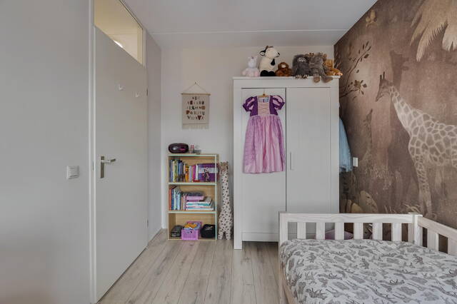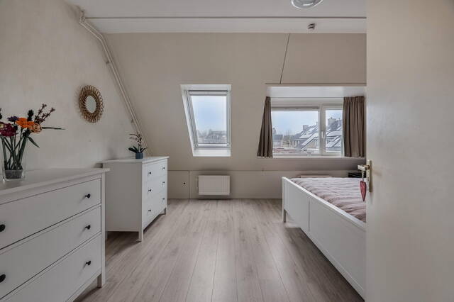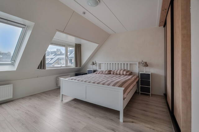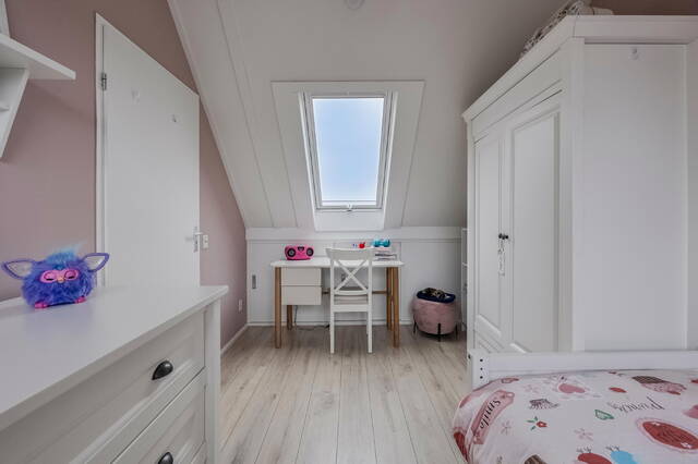 Slaapkamer 3 (ca. 11 m2) beschikt over een kunststof dakkapel met elektrisch bedienbaar rolluik en hor, een Velux dakraam met verduisterend gordijn, een lichte laminaatvloer en bergruimte achter het knieschot aan beide kanten. Deze slaapkamer is verrassend ruimtelijk dankzij de dakkapel en het dakraam, waardoor er natuurlijke lichtinval is en de ruimte optimaal wordt benut.