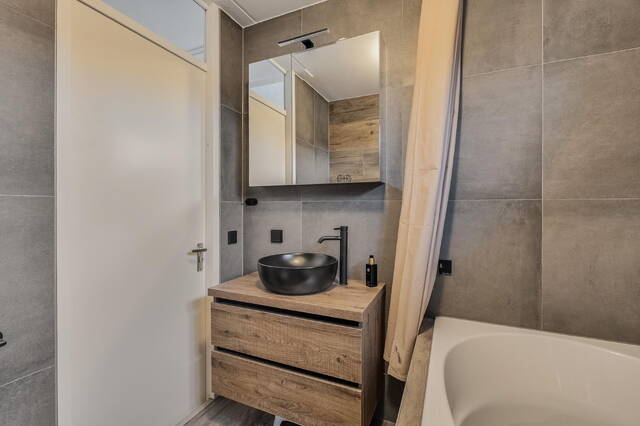 De moderne badkamer (ca. 4 m2) is in 2021 gerenoveerd. De sanitaire voorzieningen zijn een wastafel met wastafelmeubel en extra stopcontacten voor het scheerapparaat en haardroger, spiegel met spiegelkast en verlichting, hangend tweede toilet en een ligbad. De badkamer is geheel betegeld in een lichte kleurstelling.