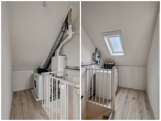 Voorzolder met de omvormer voor de 6 zonnepanelen, stelplaats voor de HR C.V. combiketel (intergas 2022), mechanische ventilatie, wasmachine- en drogeraansluiting en aan beide kanten bergruimte achter het knieschot. Het Velux dakraam zorgt voor voldoende natuurlijke lichtinval.