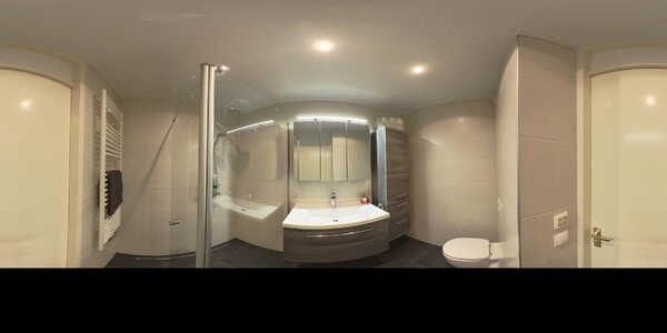De luxe badkamer is volledig betegeld in moderne beige/grijstinten en uitgerust met een fraai wastafelmeubel met spiegelkast en verlichting, een tweede hangend toilet en een royale inloopdouche met glazen wand en regendouche.