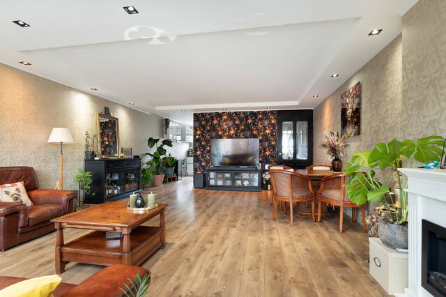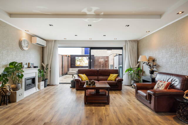 Via de zwarte glazen paneeldeur bereikt u de tuingerichte woonkamer – uitgebouwd, voorzien van grote schuifpui, waardoor daglicht rijkelijk naar binnen stroomt. De laminaatvloer met vloerverwarming, spotverlichting in het plafond, convectorradiator en een sfeervolle elektrische haard zorgen voor sfeer én comfort. Daarnaast is er airconditioning aanwezig voor zowel koeling als verwarming.