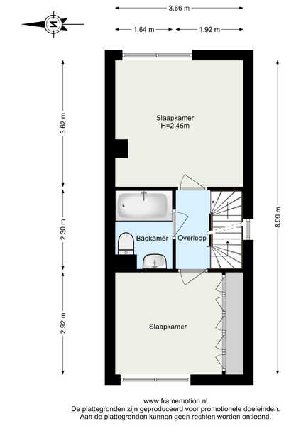 De overloop biedt toegang tot twee slaapkamers en de badkamer.