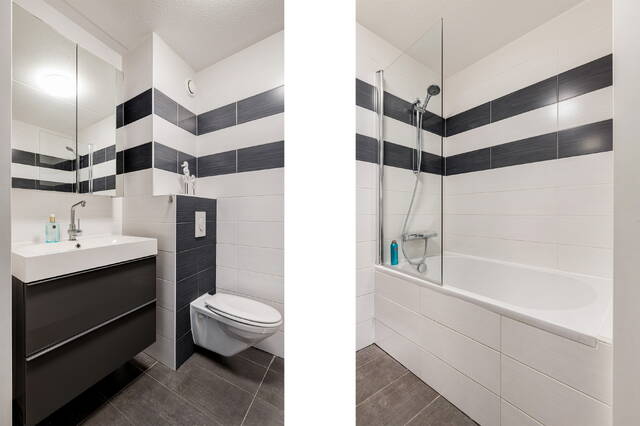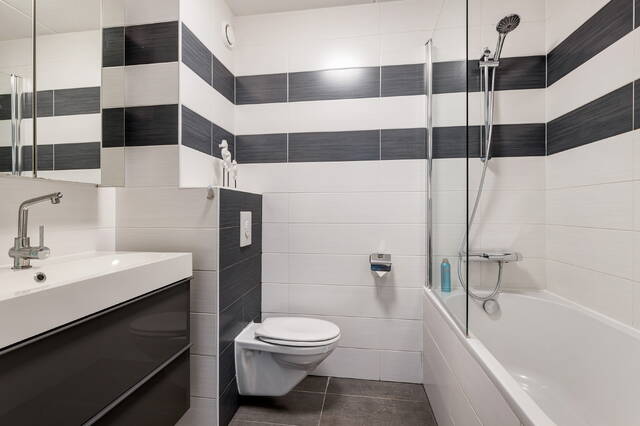 De badkamer is compleet uitgevoerd met een ligbad, een tweede hangend toilet en een wastafelmeubel met spiegelkast. De ruimte is volledig betegeld in een frisse wit/antracietgrijze kleurstelling.