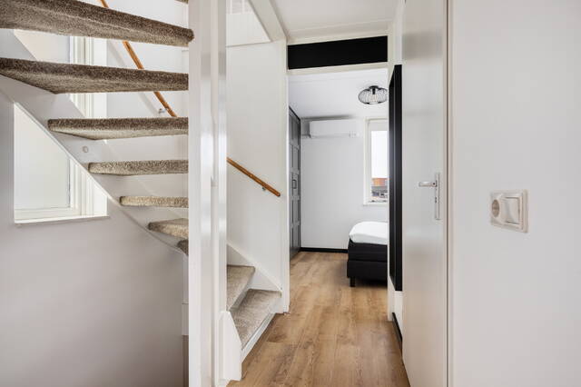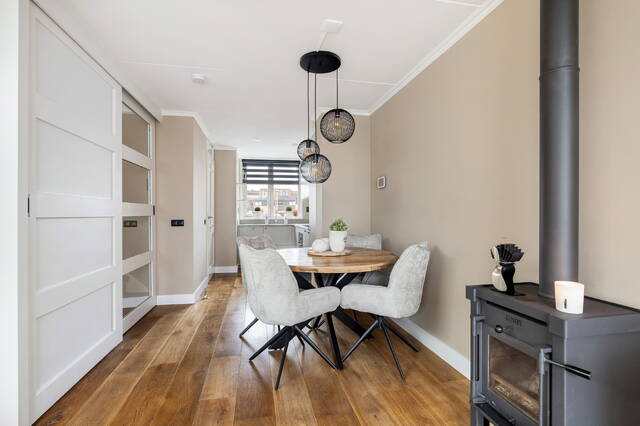 De begane grond is voorzien van een houten vloer en biedt een warme, huiselijke uitstraling. In de woonkamer zorgt een vrijstaande houtkachel voor extra sfeer en comfort, terwijl de aanwezige airconditioning bijdraagt aan een aangenaam binnenklimaat in alle seizoenen. De trap en trapkast zijn netjes afgesloten met fraaie schuifdeuren.