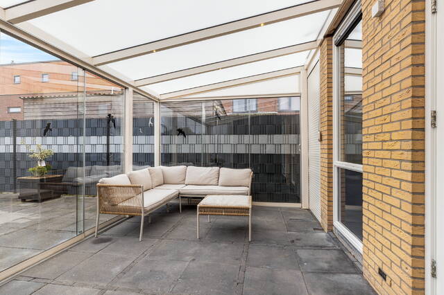 Aan de achterzijde bevindt zich de woonkamer met openslaande deuren naar de serre. Deze aangebouwde serre is een heerlijke verlenging van de leefruimte en is voorzien van verlichting en een glazen schuifwand, waardoor deze aan de tuinzijde volledig geopend kan worden.