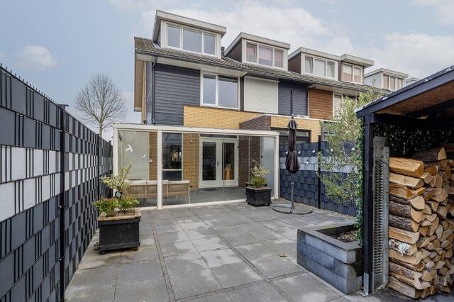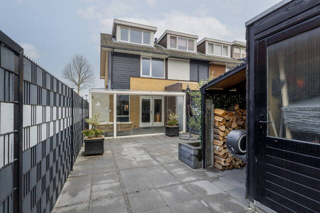 De achtertuin is gelegen op het oosten, netjes aangelegd met bestrating en volledig omheind. Achterin de tuin staat een houten berging met een aangebouwde overkapping, ideaal voor het opslaan van haardhout of het stallen van een scooter of motor. De tuin is tevens bereikbaar via een praktische achterom.