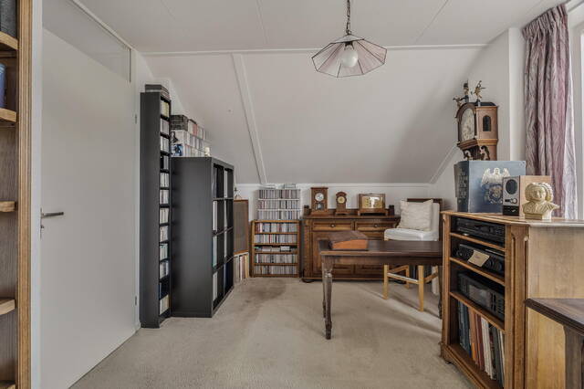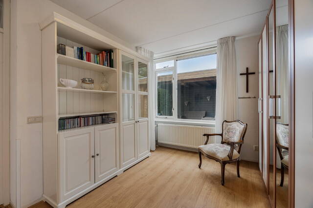 De slaapkamer aan de voorzijde strekt zich uit over de volledige breedte van de woning en is dankzij de grote raampartijen heerlijk licht. Aan de achterzijde bevinden zich twee slaapkamers, waarvan één is voorzien van een extra dakraam. Vanuit de andere 3e slaapkamer is de ruime vliering bereikbaar, waar zich tevens de opstelplaats van de cv-ketel bevindt en volop bergruimte aanwezig is.