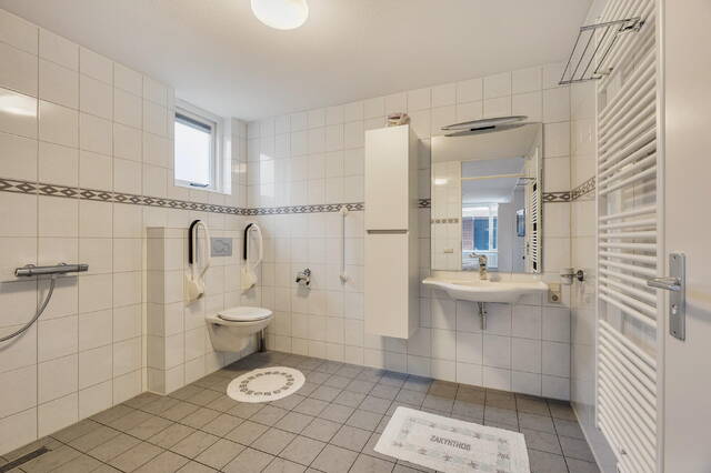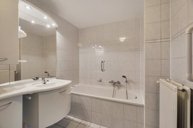 De badkamer op deze verdieping is volledig betegeld in lichte kleuren en uitgerust met een ligbad, douche, toilet en wastafel.