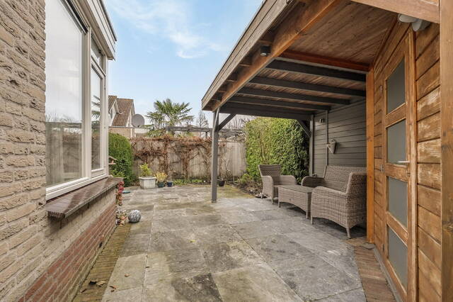 De tuin is gelegen op het oosten en biedt volop mogelijkheden om te genieten. De tuin beschikt over een achterom, een houten berging met overkapping, een buitenkraan en een zonnescherm. Door de hoekligging geniet u van extra privacy en ruimte.