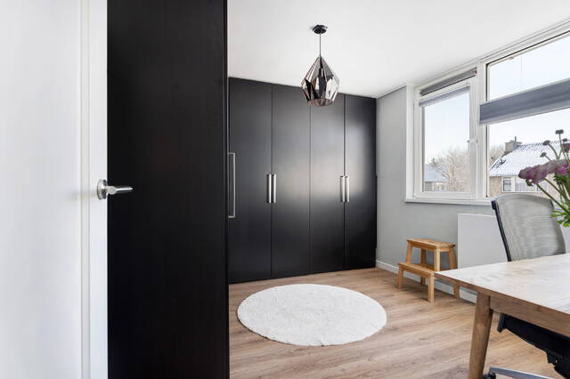 De overloop geeft toegang tot drie slaapkamers — twee aan de achterzijde en één aan de voorzijde — elk voorzien van strak afgewerkte convectorradiatoren en een UTP-aansluiting. De ouderslaapkamer heeft fraai behang; de overige kamers zijn voorzien van glad stucwerk op de wanden. De vloer op deze verdieping is afgewerkt met een laminaatvloer.