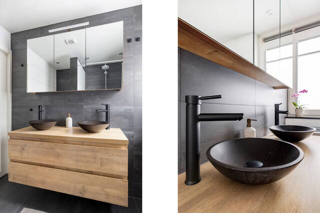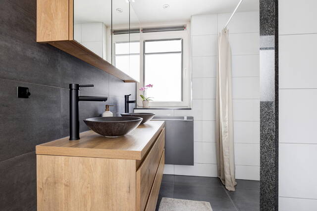 De badkamer is volledig betegeld in grijs-witte tinten en beschikt over een inloopdouche, tweede hangend toilet, stijlvol houten wastafelmeubel met twee waskommen en een brede spiegelkast. Een zwart glazen passende douchewand is aanwezig en indien gewenst kan deze door de koper geplaatst worden.