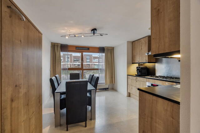 De woning beschikt aan de voorzijde over een nette keuken (ca. 15 m2) met inbouwapparatuur. De keuken is uitgevoerd in een L-opstelling en voorzien van een koelkast, vrieskast, 5-pits gaskookplaat, RVS afzuigkap, combi-ovenmagnetron en een vaatwasser. Tevens is de keuken voorzien van een anderhalve spoelbak en voldoende kastruimte. Het geheel is uitgevoerd in lichte kleuren en afgewerkt met een kunststof aanrechtblad en marmeren tegelvloer met vloerverwarming.