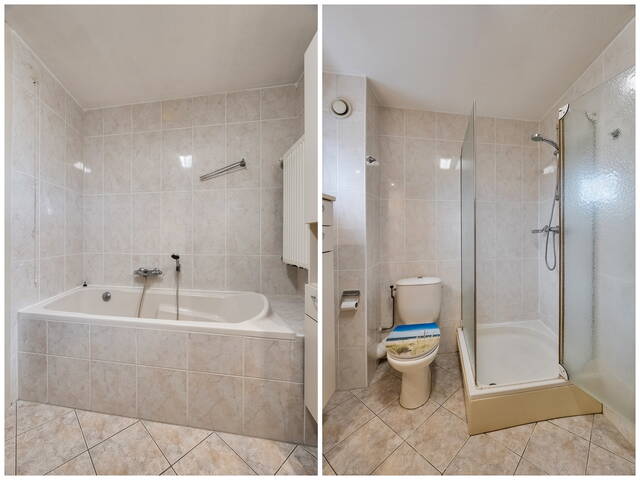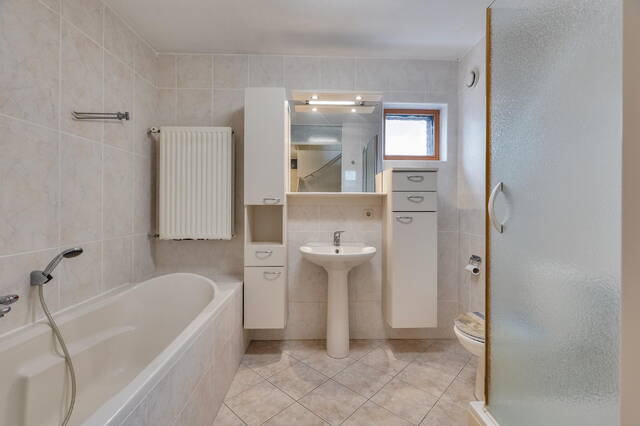 De nette badkamer (ca. 6 m2) is voorzien van sanitaire voorzieningen zoals een wastafel, spiegel en verlichting, het tweede toilet, een douchecabine, een ligbad en twee kasten om eventueel handdoeken en badartikelen op te bergen. De badkamer is geheel betegeld in een lichte kleurstelling.