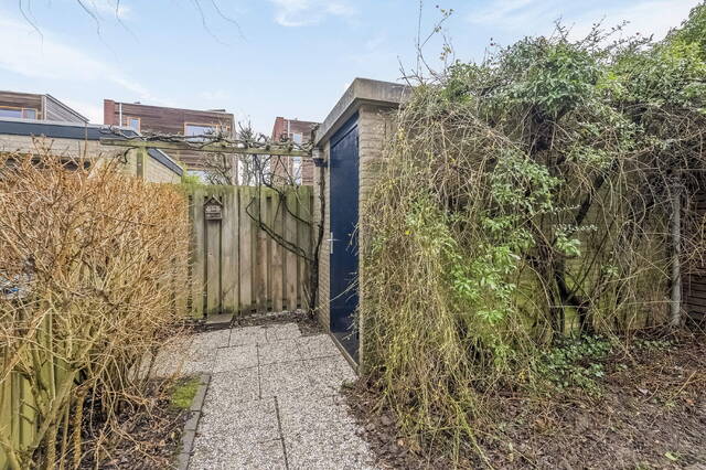 De achtertuin ligt op het westen. In deze tuin kunt u heerlijk genieten van de middag- en avondzon. De achtertuin is voorzien van achterom, bestrating, beplanting, een buitenkraan, handmatig bedienbaar zonnescherm en een ruime berging.