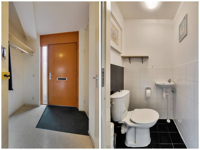De voortuin is voorzien van een handige buitenkraan. Entree, ruime hal met meterkast, garderobe, trap naar de 1e verdieping en trapkast met de verdeling voor de vloerverwarming, toiletruimte voorzien van een duoblok toilet en fonteintje. De toiletruimte is gedeeltelijk betegeld.