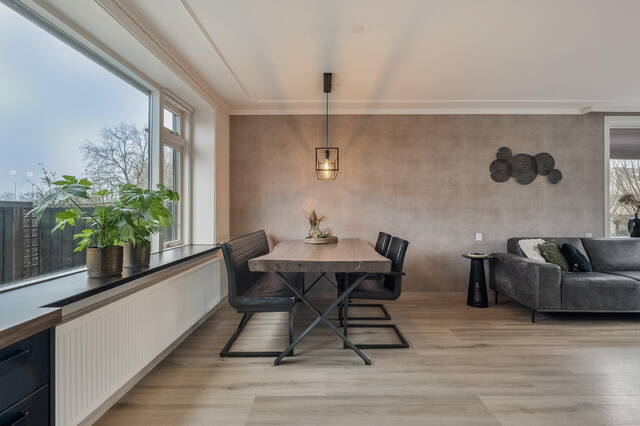 Het lichte doorzon woongedeelte (ca. 32 m2) wordt gekenmerkt door grote raampartijen aan de voor-, achter- én zijkant, wat zorgt voor een aangename lichtinval gedurende de hele dag. De woonkamer biedt verder voldoende ruimte voor het creëren van een eetgedeelte naast de woonkeuken. De ruimte is afgewerkt met een brede laminaatvloer, strak gestucte wanden en plafond.