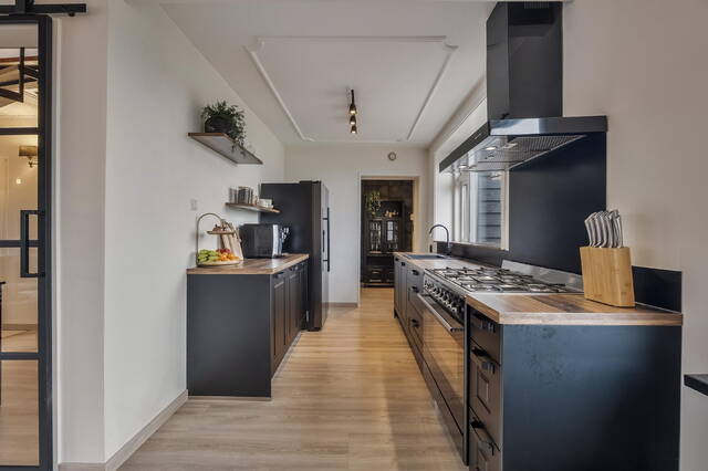 De woonkeuken is gelegen aan de achterzijde van de woning en is compleet uitgevoerd met een Amerikaanse koelkast van het merk Samsung, een Smeg 6-pits fornuis met oven, een bijpassende Smeg afzuigkap, een vaatwasmachine en een zwarte spoelbak. De keuken is verder uitgevoerd in twee rechte opstellingen, afgewerkt met kunststof aanrechtbladen met houtlook. Dankzij de grote raampartij in de keuken is er een prachtig uitzicht op de royale achtertuin. Via de keuken is de binnenhal naar de bijkeuken en de badkamer 1. De ramen aan de achtergevel op de begane grond zijn voorzien van elektrisch bedienbare rolluiken.