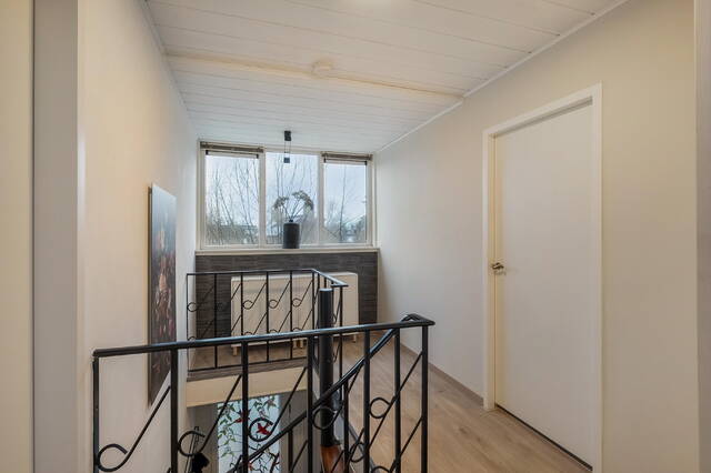 Lichte overloop met toegang tot alle vertrekken en ruime bergruimte achter het knieschot. De overloop is afgewerkt met laminaatvloer. Gedeeltelijk betegelde toiletruimte voorzien van een hangcloset.