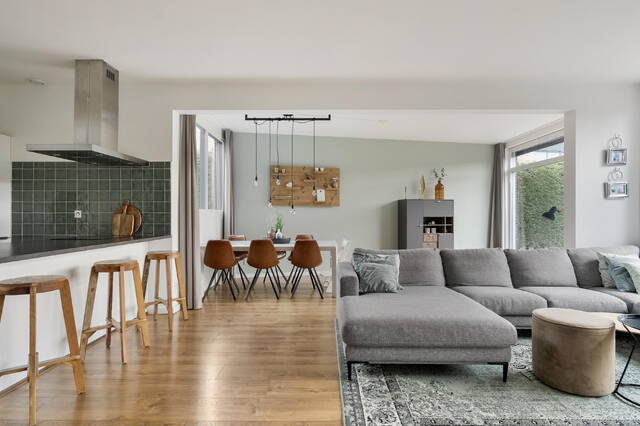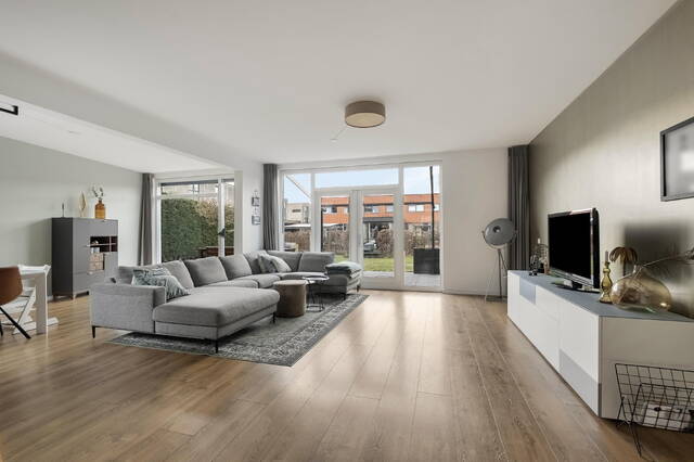 Vanuit de hal bereikt u via openslaande deuren de royale woonkamer. Dankzij de uitbouw aan de zijkant is hier een bijzonder ruime leefruimte ontstaan met volop mogelijkheden voor een grote zithoek en een royale eethoek. De grote raampartijen aan de tuinzijde zorgen voor een prachtige lichtinval en een fraai uitzicht op de diepe achtertuin. De gehele begane grond is afgewerkt met een laminaatvloer met vloerverwarming.